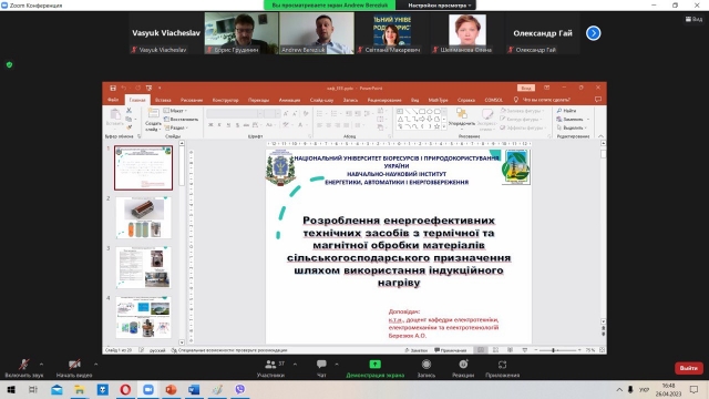 Кафедра електротехніки, електромеханіки та електротехнологій долучилась до зустрвчі із доповіддю на тему: «Розроблення енергоефективних технічних засобів з термічної та магнітної обробки матеріалів сільськогосподарського призначення шляхом використання індукційного нагріву», яку представив Андрій Березюк, доцент кафедри електротехніки, електромеханіки та електротехнологій, кандидат технічних наук, доцент.