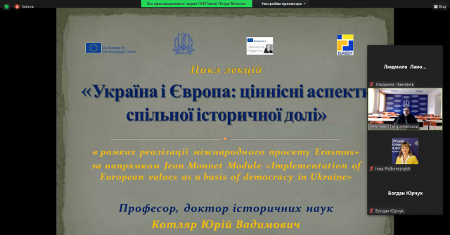 У січні 2023 р. викладачі кафедри міжнародних відносин і суспільних наук разом зі студентами та аспірантами кафедри у рамках професійного зростання долучилися до курсу відкритих онлайн-лекцій доктора історичних наук, професора Чорноморського Національного університету імені Петра Могили Юрія Котляра «Україна і Європа: ціннісні аспекти спільної історичної долі». Курс відбувається в межах реалізації міжнародного проєкту Erasmus+ за напрямком Jean Monnet Module «Implementation of European values as a basis of democracy in Ukraine».