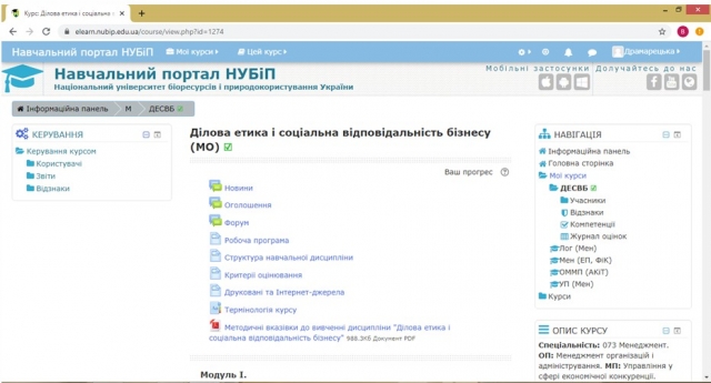 Згідно наказу ректора НУБіП України «Про заходи у НУБіП України у зв’язку з оголошенням карантину» від 11.03.2020 р. № 247, викладачами кафедри менеджменту імені професора Й. С. Завадського факультету аграрного менеджменту викладання дисциплін реалізується у дистанційному режимі. Зручним і зрозумілим інструментом для всіх користувачів, оскільки практикується у НУБіП України вже багато років, є використання електронних навчальних курсів на платформі дистанційного навчання Moodle. За допомогою системи електронного навчання E-learn студентам надаються покрокові інструкції як організувати самостійну роботу поза межами університету.