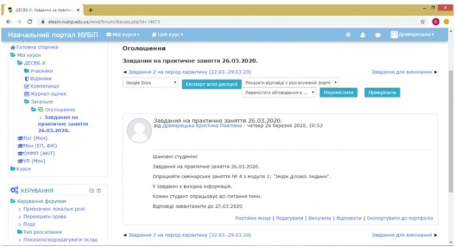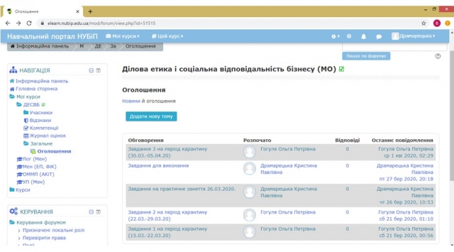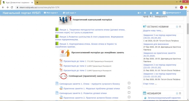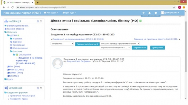 Щотижня до кожного лекційного заняття лектор, доцент кафедри Ольга Петрівна Гогуля, чітко формулює студентам завдання у межах теми, що передбачена для вивчення (згідно робочої програми) та розміщує на курсі, з поясненнями щодо опрацювання такого матеріалу, окреслює питання для обговорення. Так, для прикладу, під час карантину: - 15.03.20-22.03.20 опрацювати лекційний і презентативний матеріал до теми «Соціальна відповідальність як чинник сталого розвитку» та виконати відповідну самостійну роботу (питання додаються);