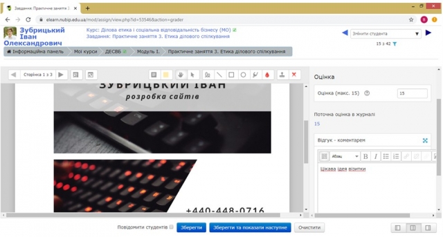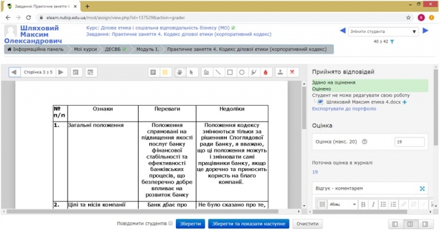 Слід відмітити, що більшість студентів групи старанно і відповідально працюють над вивченням дисципліни «Ділова етика і соціальна відповідальність бізнесу», детально вивчають лекційний матеріал, вчасно виконують поставлені завдання, демонструють творчий підхід до його засвоєння. Зокрема, найбільш активними є Максим Шляховий, Іван і Злата Зубрицькі, Діана Пирогова, Світлана Решетнікова, Андрій Нікітенко. Дистанційне навчання потребує потужної особистісної мотивації, вміння навчатися самостійно, формування навичок самодисципліни, правильної організації, розподілу і використання часу, що є вкрай важливим для майбутніх фахівців з менеджменту.