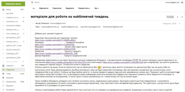 З ініціативи деканату факультету аграрного менеджменту, у межах організації програми дистанційного навчання кафедрою менеджменту ім. проф. Й.С. Завадського 23 березня був запланований online-семінар з дисципліни Лідерство на тему: «Особистісні аспекти лідерства». Він міг стати ще одним клопотом для студентів 4-го курсу спеціальностей «Менеджмент» і «Маркетинг», адже питання ускладнювалось незвичною формою комунікації - групове обговорення через використання програми ZOOM, яка від більшості учасників вимагала освоєння нового програмного забезпечення та нових прийомів групової роботи.