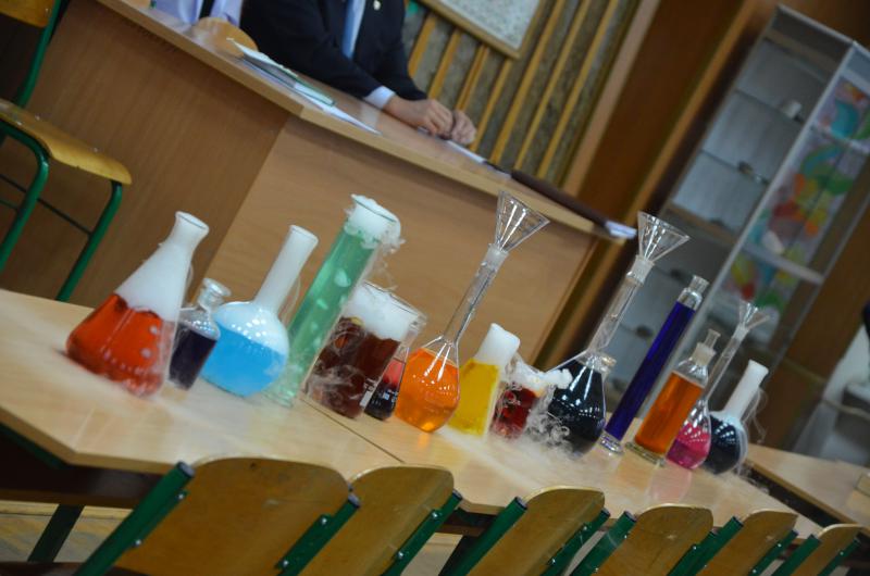 Студентам було запропоновано хімічне шоу, з яскравими демонстраційними дослідами із запитаннями та поясненнями. Ми побачили кольорові димові хімічні коктейлі, палаючу мильну піну, викликали «дух науки».