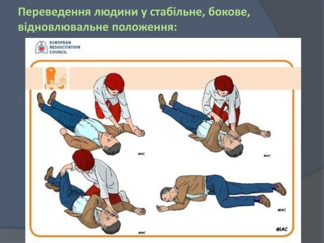 - Стабільне бокове положення: Навчилися правильно класти потерпілого в стабільне бокове положення для забезпечення вільного дихання та запобігання задухи.