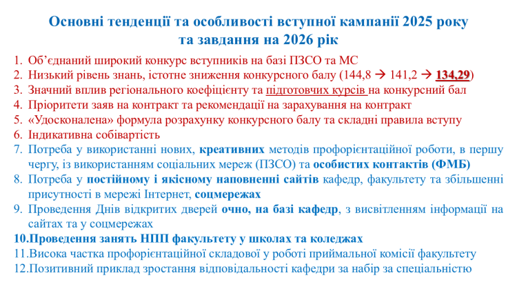 Водночас Вячеслав БРАТІШКО окреслив і виклики, з якими стикається колектив. Зокрема, потребує уваги рівень базової підготовки вступників зі скороченим терміном навчання, особливо з математичних дисциплін, а також тенденції до зменшення набору на ОС «Магістр» за окремими спеціальностями.