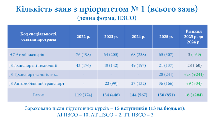 Аналізуючи результати року, декан акцентував увагу на вступній кампанії. Попри складні умови, факультет продемонстрував позитивну динаміку: загальна кількість заяв від вступників зросла на 284 у порівнянні з минулим роком. Особливим успіхом став запуск нової освітньої програми «Транспортна логістика», яка викликала значний інтерес серед абітурієнтів. Також спостерігається зростання популярності спеціальностей «Агроінженерія» та «Автомобільний транспорт».