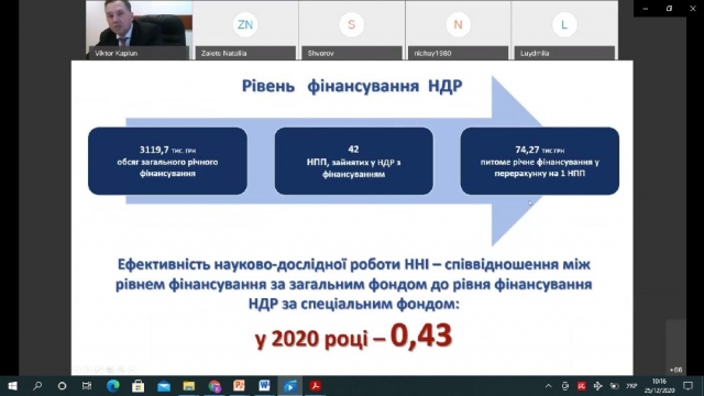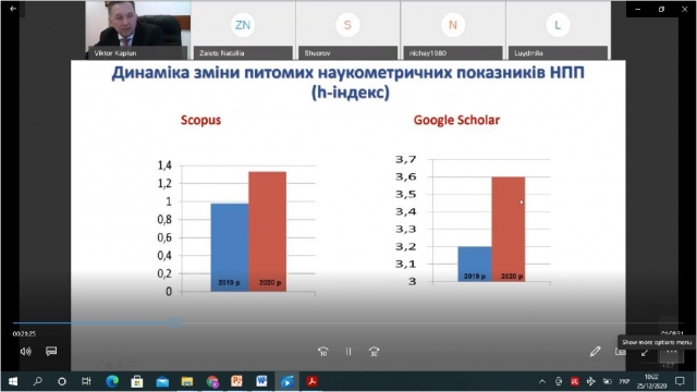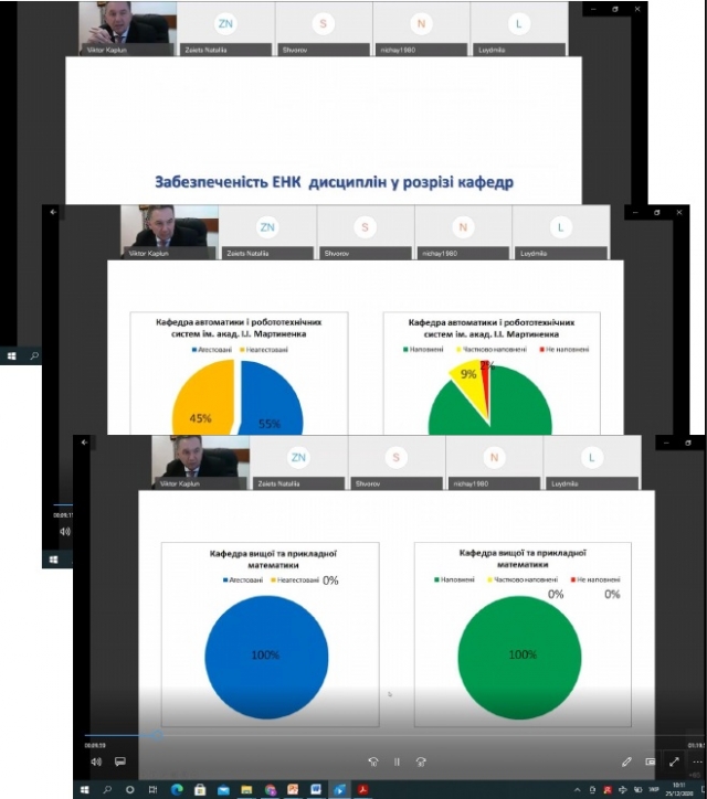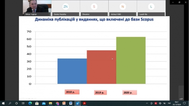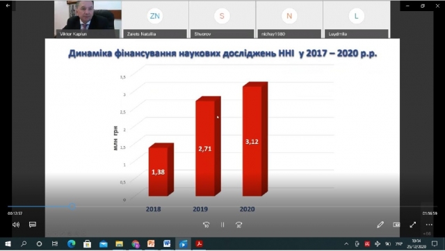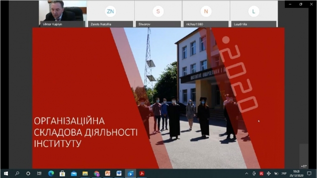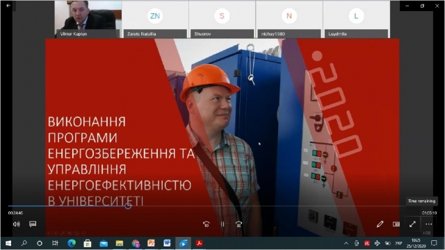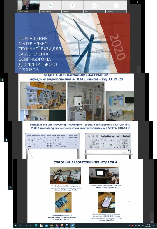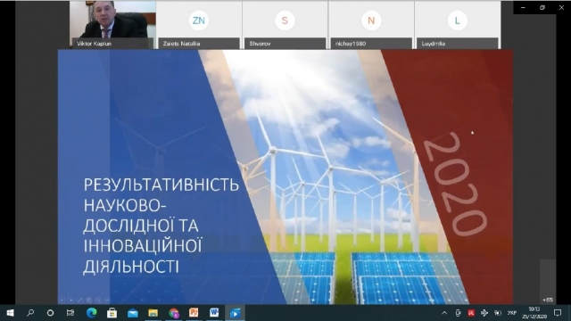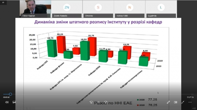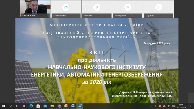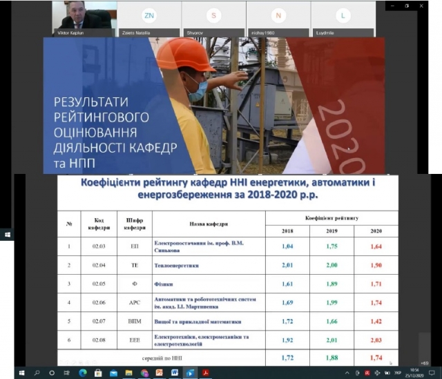 З доповіддю про результати діяльності ННІ енергетики, автоматики і енергозбереження у 2020 році виступив директор інституту Віктор Каплун. Для аналізу діяльності доповідач основну увагу приділив освітній, науково-інноваційній, проектній та організаційній роботі в розрізі кафедр та наявних наукових проєктів.