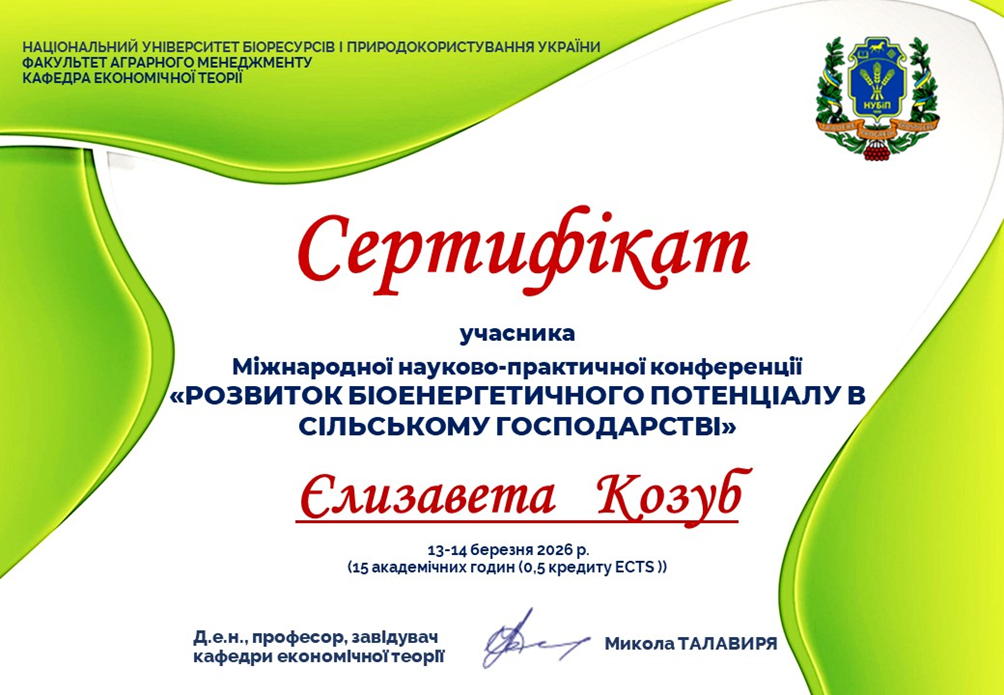 Студенти гуртка “Макроекономічні аспекти економічного зростання в Україні” брали участь у Міжнародній науково-практичні конференції “Розвиток біоенергетичного потенціалу в сільському господарстві", яка відбулася 13-14 березня 2026 року, де зустрілися найкращі експерти, практики та науковці цього напрямку для обміну знаннями й досвідом.