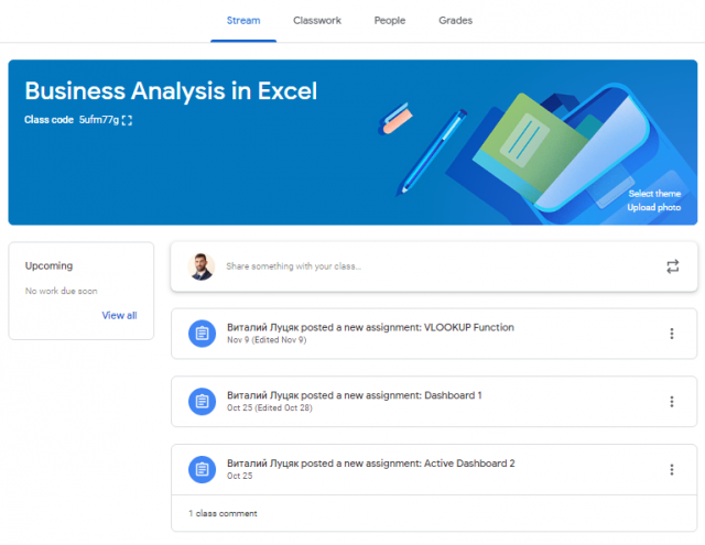 Структура курсу Business Analysis in Excel у додатку Google Classroom та на платформі Elearn;