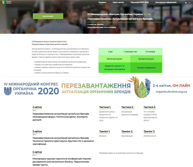 Конгрес Органічна Україна – це Міжнародний захід, започаткований для об’єднання спільноти органічного сектору України та для розвитку міжнародного партнерства в Україні. В 2020 році ми анонсуємо тему: «Перезавантаження. Актуалізація органічних брендів» і ставимо завдання оновити органічний сектор України через