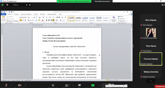 Тетяна Харіна, здобувачка ОС «Магістр» за освітньою програмою «Якість, стандартизація та сертифікація», розробила Кодекс Корпоративної Етики для Благодійного фонду "Життєлюб", який підтримує людей похилого віку.