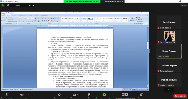 Студенти активно взяли участь у обговорені звітів по виконанню самостійної роботи і створили цілі проєкти із використання корпоративних кодексів, або розробили власні положення з корпоративної етики.