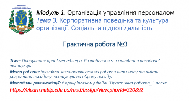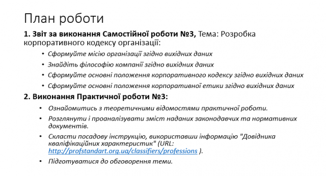 Інші студенти завантажили свої проєкти на Навчально-інформаційний портал НУБіП України. Друга частина заняття була присвячена вивченню законодавчих та нормативних документів щодо планування праці та набуттю практичних навичок зі складання посадових інструкцій з використанням інформації "Довідника кваліфікаційних характеристик".