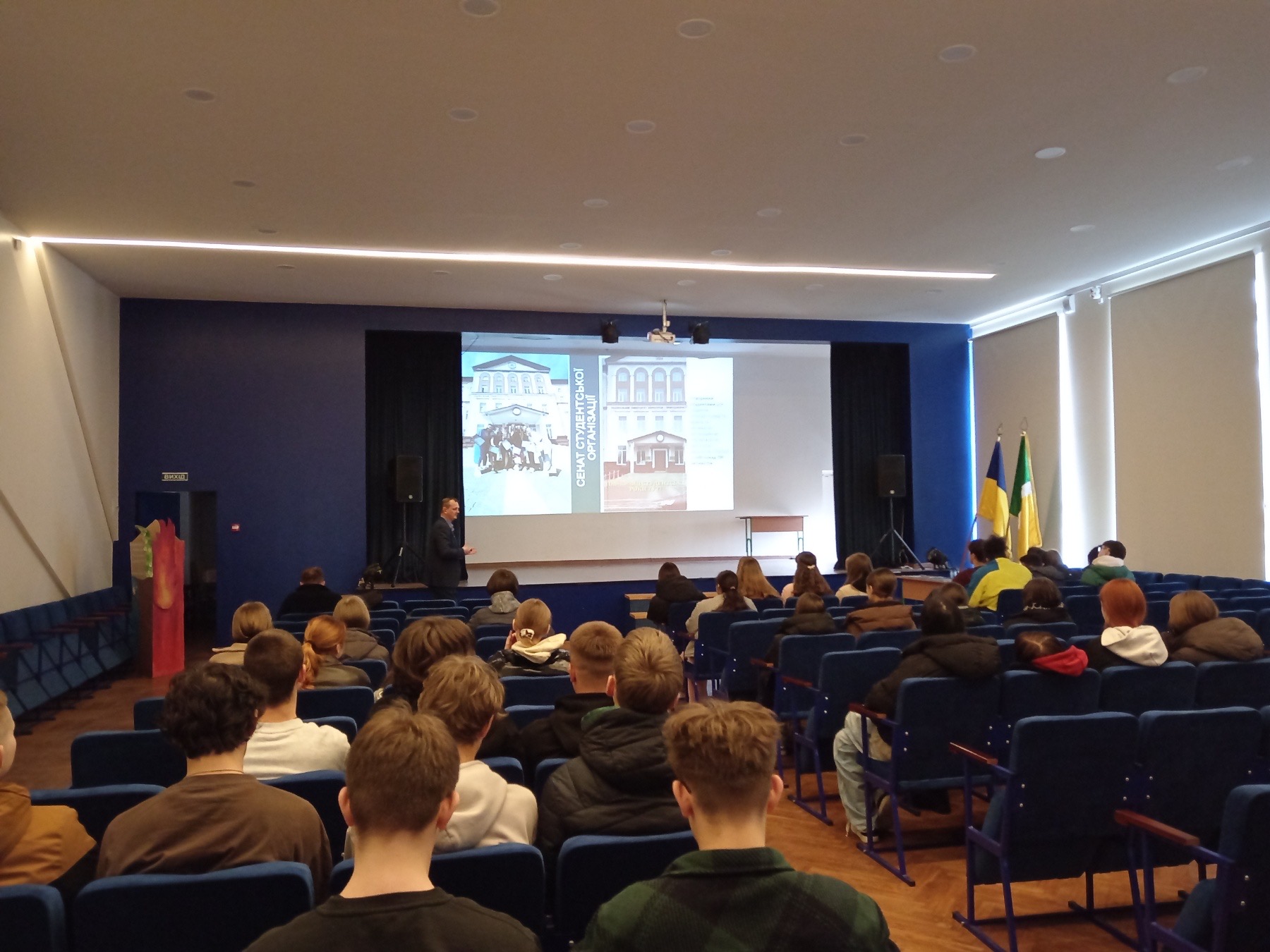 Знайомство з університетом розпочалося з виступів провідного фахівця відділу профорієнтації та маркетингу Віктора ШЕВЧУКА та заступника відповідального секретаря приймальної комісії Володимира БЛИЩИКА. Вони розкрили ліцеїстам усі переваги навчання в НУБіП − від потужної матеріально-технічної бази до міжнародних програм стажування.