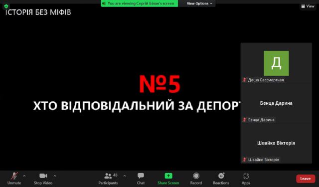 Професор, д.і.н. Сергій Білан долучившись до обговорення, запропонував аудиторії ознайомитися із коротким відеоматеріалом із циклу «Історія без міфів» «1944: депортація кримських татар:10 запитань історику».