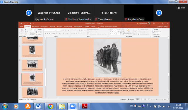 Викладачі кафедри міжнародних відносин і суспільних наук спільно із студентами спеціальностей «Міжнародні відносини, суспільні комунікації, регіональні студії», «Готельно-ресторанний бізнес», «Агрономія», Боярського фахового коледжу, провели on-line зустріч, присвячену Дню пам’яті жертв геноциду кримськотатарського народу.