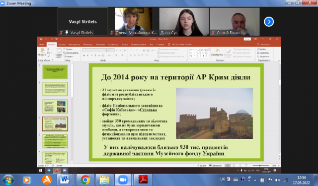 Студентки спеціальності «готельно-ресторанний бізнес» Дарина Рибалко і Дана Сус виступили із доповідями і презентаціями «Депортація кримських татар» і «Культурна спадщина Криму в умовах російської анексії», в яких деталізували причини і наслідки депортації та проблему незаконного переміщення музейних цінностей, руйнації пам’яток архітектури та інших об’єктів культурної спадщини після 2014 року.