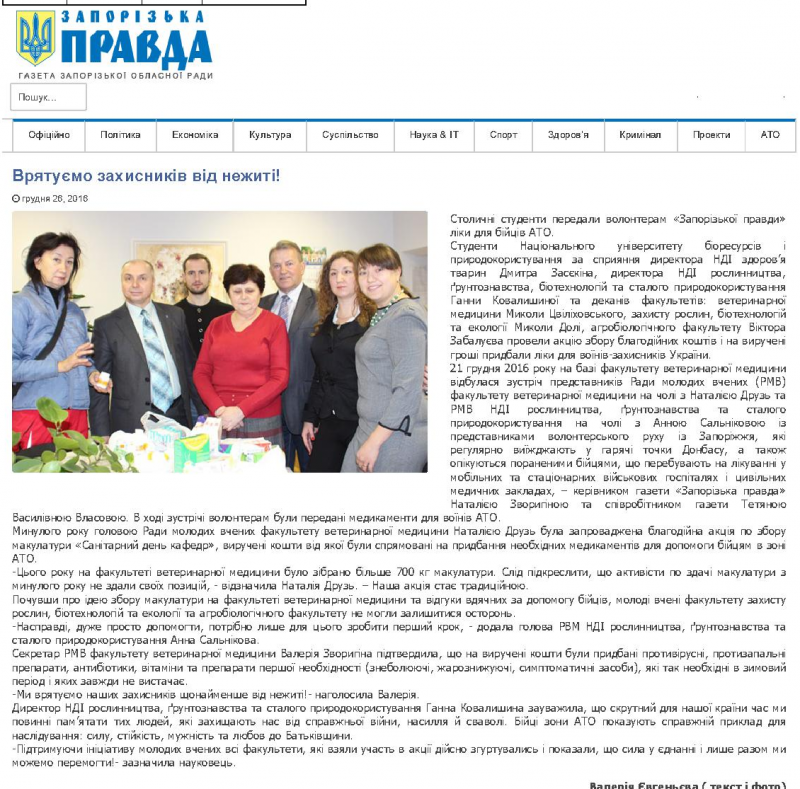 21 грудня 2016 року на базі факультету ветеринарної медицини відбулася зустріч представників Ради молодих вчених факультету ветеринарної медицини на чолі з Наталією Віталіївною Друзь та РМВ НДІ рослинництва, ґрунтознавства та сталого природокористування на чолі з Анною Валеріївною Сальніковою із представниками волонтерського руху із Запоріжжя, які регулярно виїжджають у гарячі точки Донбасу, а також опікуються пораненими бійцями, що перебувають на лікуванні у мобільних та стаціонарних військових госпіталях і цивільних медичних закладах, – головним редактором газети «Запорізька правда» Наталією Георгіївною Зворигіною та співробітником газети Тетяною Василівною Власовою.
