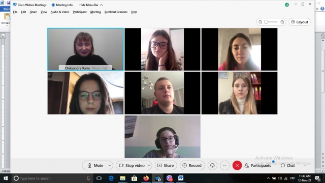 26 листопада 2021 року відбулася он-лайн зустріч студентів 3 курсу 5 групи з наставником доцентом кафедри адміністративного менеджменту та зовнішньоекономічної діяльності Ралко Олександрою Сергіївною. Зустріч було проведено за допомогою платформи Webex.