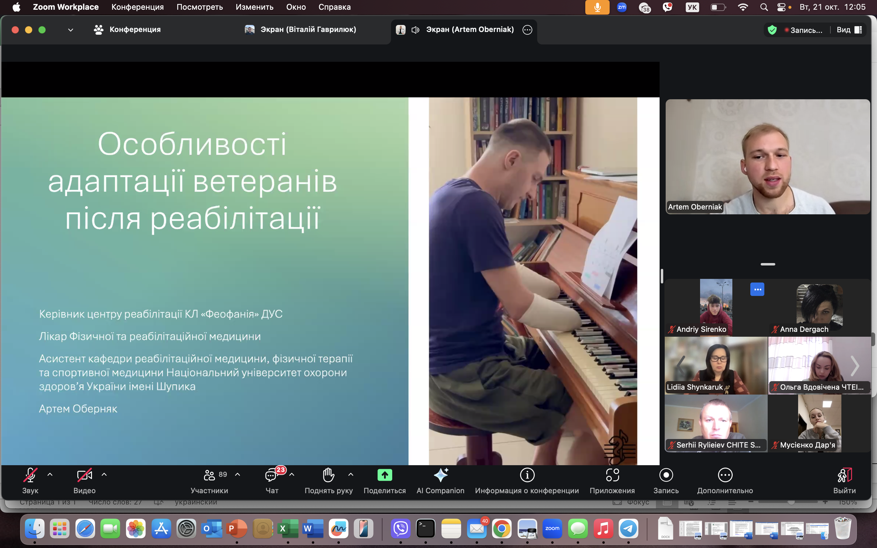 Особливого резонансу пленарному засіданню надав виступ Артема ОБЕРНЯКА, керівника Центру реабілітації Клінічної лікарні «Феофанія». Він підняв надзвичайно важливу та чутливу тему адаптації ветеранів після складних операцій та ампутацій. Емоційно сколихнувши присутніх, доповідач продемонстрував мотивуючі відеоматеріали, де військовослужбовці, які проходять реабілітацію (зокрема, з протезами рук або ніг), навчаються грати на музичних інструментах і активно займаються спортом. Керівник Центру наголосив, що справжня інклюзія починається з соціального та психологічного відновлення, а також зі створення умов, де фізичні обмеження не стають бар’єром для повноцінного життя, що є життєво необхідним для стійкості та відновлення українського суспільства.