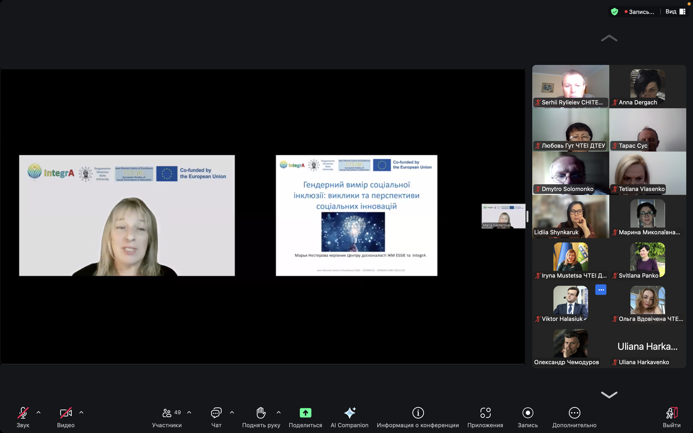 Окрему важливу роль при реалізації європейських цінностей та стратегії інклюзивного розвитку України відіграють гендерно-чутливі підходи у соціальних інноваціях. Саме про це говорила доктор філософських наук, професор Марья НЕСТЕРОВА, яка є керівником Центру Досконалості Жана Монне «Європейські Студії соціальних інновацій в освіті» УДУ імені Михайла Драгоманова та засновником IntegrA Verein für Social Integration, Social Inclusion und Nachhaltige Entwicklung (Австрія). Слід відзначити, що з Марьєю НЕСТЕРОВОЮ ми активно співпрацюємо вже не один рік в рамках інших міжнародних проєктів та наукових заходів.