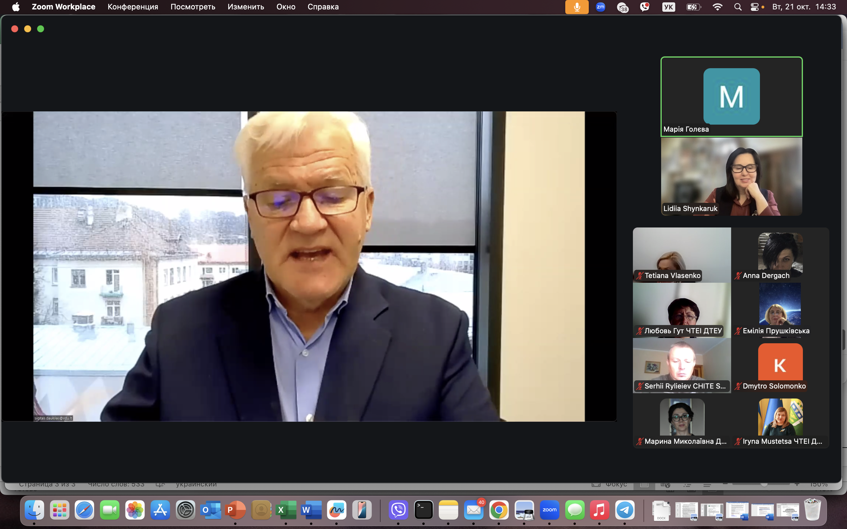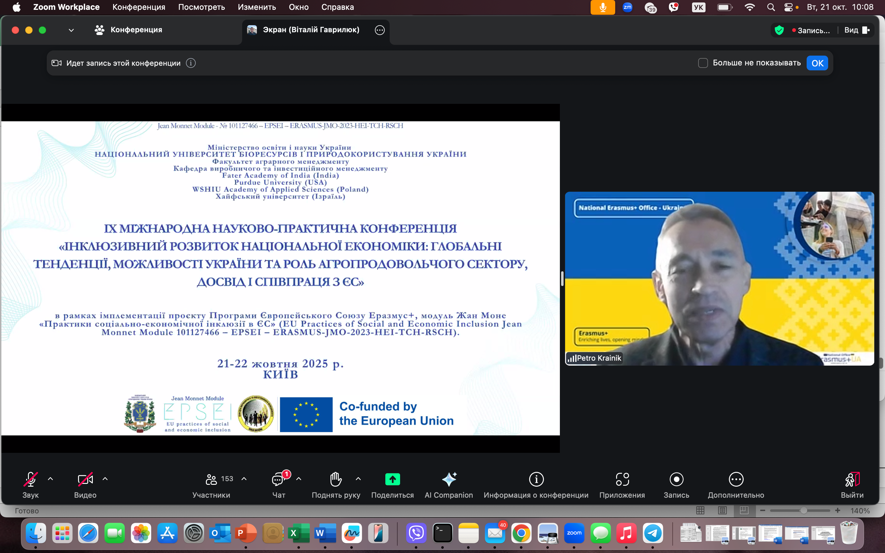Особливої ваги заходу надало привітання від Петра КРАЙНІКА, проєктного менеджера Національного Erasmus+ офісу в Україні та куратора програм Жан Моне. У своєму зверненні він високо оцінив зусилля колективу проєкту, наголосивши, що фокус на економічній інклюзії є прогресивним та одним із перших серед вітчизняних університетів. Петро КРАЙНІК підкреслив, що повне усвідомлення інклюзивності, як європейської цінності, є ключовим елементом успішної євроінтеграції України. На завершення він закликав науковців та практиків до розширення активної співпраці у рамках можливостей, які надають програми Erasmus+.