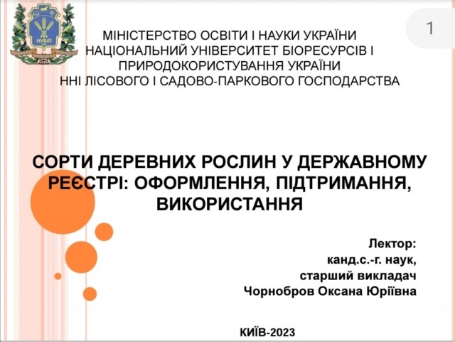20 квітня 2023 року відбулася відкрита лекція старшого викладача кафедри відтворення лісів та лісових меліорацій Оксани Чорнобров з дисципліни «Сучасні технології лісового насінництва» для студентів ОС «Магістр» спеціальності 205 «Лісове господарство» на тему «Сорти деревних рослин у Державному реєстрі: оформлення, підтримання, використання».
