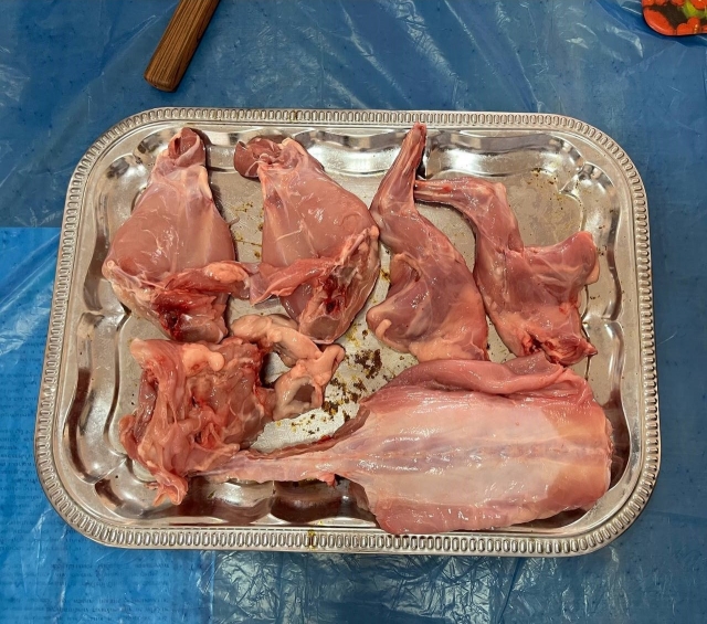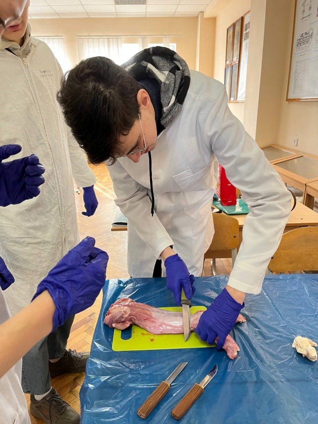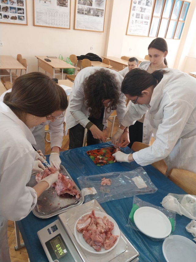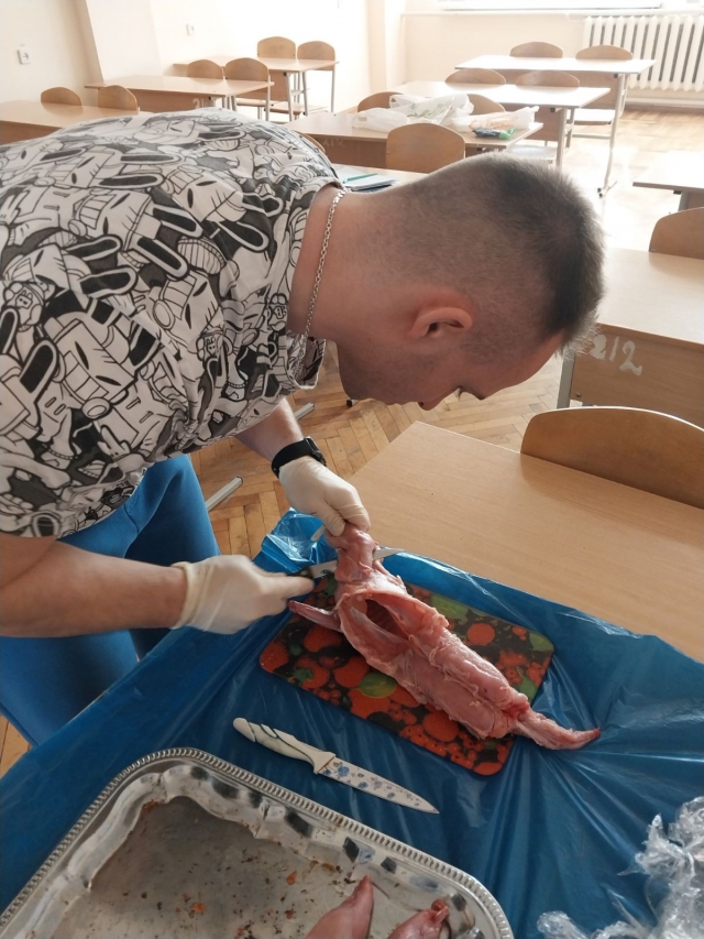 Кролівництво – одна з найприбутковіших галузей тваринництва, яка відіграє значну роль в забезпеченні людства продовольством та хутровими виробами, а кролятина за хімічним складом і харчовими властивостями перевищує м’ясо інших видів сільськогосподарських тварин. В межах вивчення дисципліни «Технологія виробництва продукції кролівництва та звірівництва» студенти 4 курсу та 3 курсу СТН провідного факультету тваринництва та водних біоресурсів» спеціальності «Технологія виробництва та переробки продукції тваринництва» ознайомилися з м’ясною продуктивністю кролів. Найбільш об’єктивну оцінку м’ясної продуктивності кролів, за кількістю і якістю м’яса, можна зробити тільки після забою. На лабораторному занятті в умовах лабораторії кролівництва та звірівництва студенти під керівництвом доцента кафедри технологій у птахівництві, свинарстві та вівчарстві – Руслани Уманець, ознайомилися з сортовим розрубом тушок кролів. Після вивчення теоретичної частини, зокрема ДСТУ 4293:2004 “ Кролі для забою” та перегляду відеоматеріалу студенти приступили до практичної частини пари. Оскільки найбільш об’єктивну оцінку м’ясної продуктивності кролів, за кількістю і якістю м’яса, можна зробити тільки після забою були придбані тушки кролів у торгівельній мережі. Під час занять студенти визначили масу тушки. Потім провели розруб тушок кролів на чотири анатомічні частини: шийно-грудний, плече-лопатковий, попереково-крижовий, тазо-стегновий та визначили: