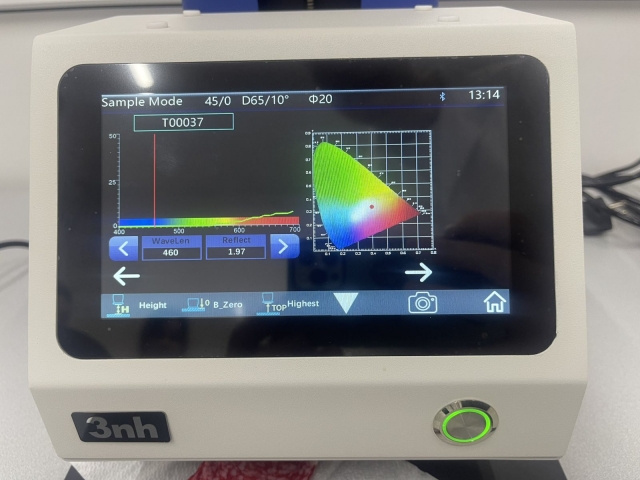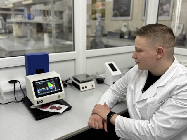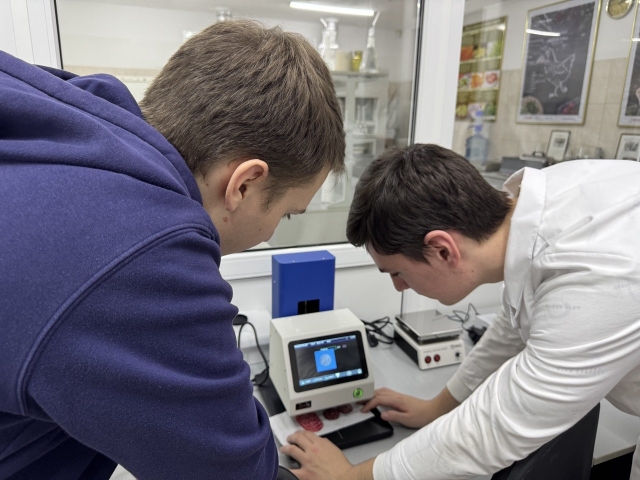 Доцент Валентина Ісраелян та асистент Марина Назаренко продемонстрували роботу на сучасному кольоровому вимірювальному приладі YL4500 Series Non-Contact Color Meter, який використовується для точного аналізу кольору на різних поверхнях без фізичного контакту. «Цей прилад застосовується у виробництві та контролі якості продукції, адже за допомогою нього можна порівняти колір з еталонним зразком і визначити ступінь відхилення, визначити інтенсивність кольору та здійснити оцінку кольорових характеристик у різних довжинах хвиль. Одним із ключових показників, що впливає на споживчі властивості м’ясних виробів, є їхній колір. Колір продукту не лише вказує на його свіжість та якість, але й впливає на естетичне сприйняття та бажання споживача придбати товар» - говорить староста Павло Паламарчук.