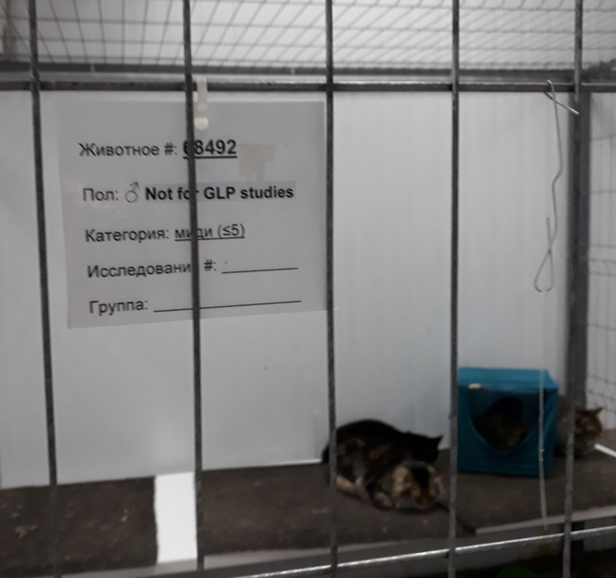 Для досліджень використовуються коти безпородні, які утримуються у спеціальних вольєрах з належним забезпеченням умов утримання, годівлі і відпочинку. На кожному вольєрі вивішена табличка з відповідним описом.