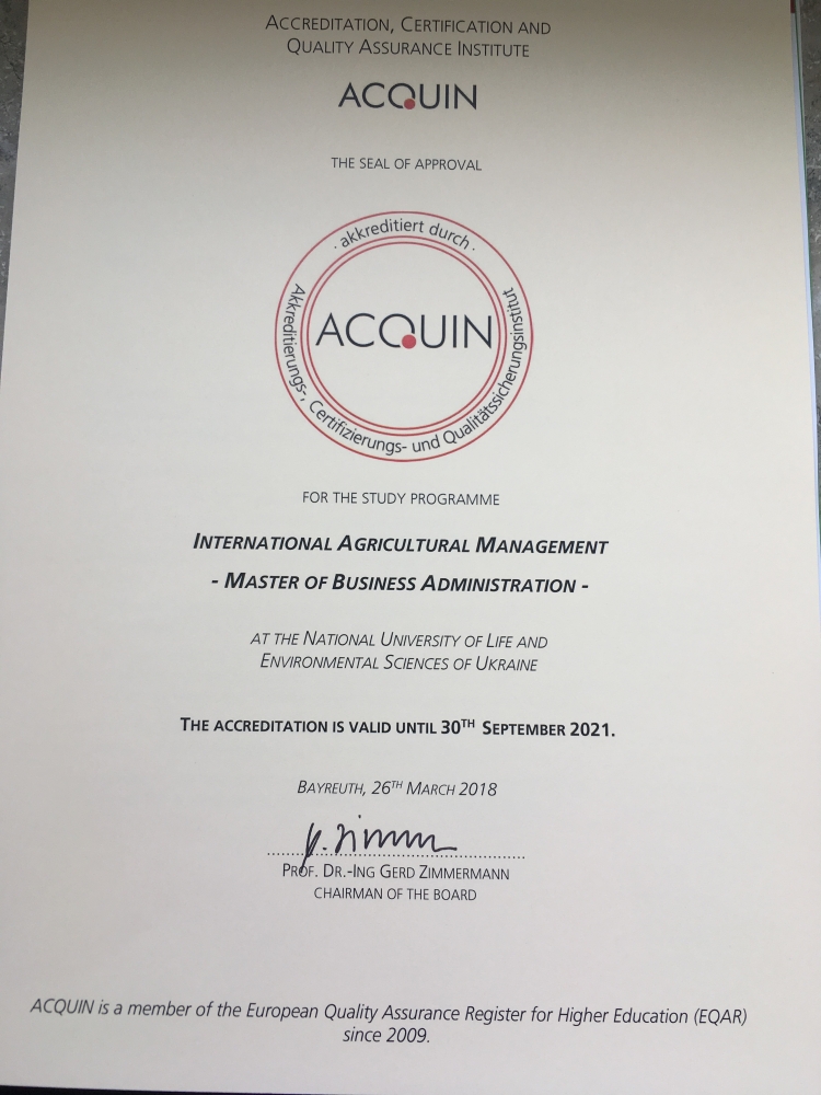 Отримана Міжнародна акредитація підтверджує відповідність навчального плану європейським вимогам до аналогічних програм в Європі, високу якість викладання в НУБіП України на програмі МВА та дає можливість студентам, що навчаються за даною програмою отримати подвійні дипломи – НУБіП України та УПН Вайнштефан (Німеччина).