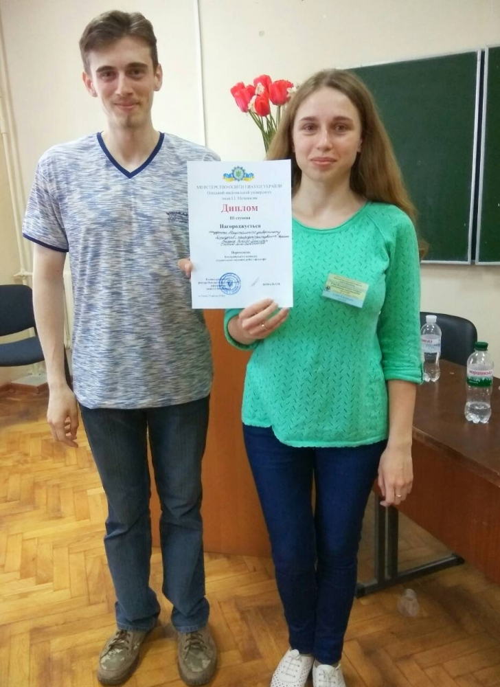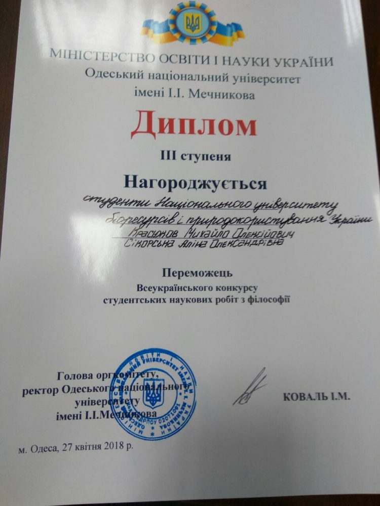Студенти-магістри факультету захисту рослин, біотехнологій та екології спеціальності «Біотехнології та біоінженерія» Михайло Красюков та Аліна Сікорська стали призерами Всеукраїнського конкурсу студентських наукових робіт з філософії та були нагороджені дипломом ІІІ ступеня Міністерства освіти та науки України. 25-28 квітня 2018 р. в Одеському національному університеті імені І.І. Мечникова відбувався захист наукових робіт, визначення та нагородження переможців.