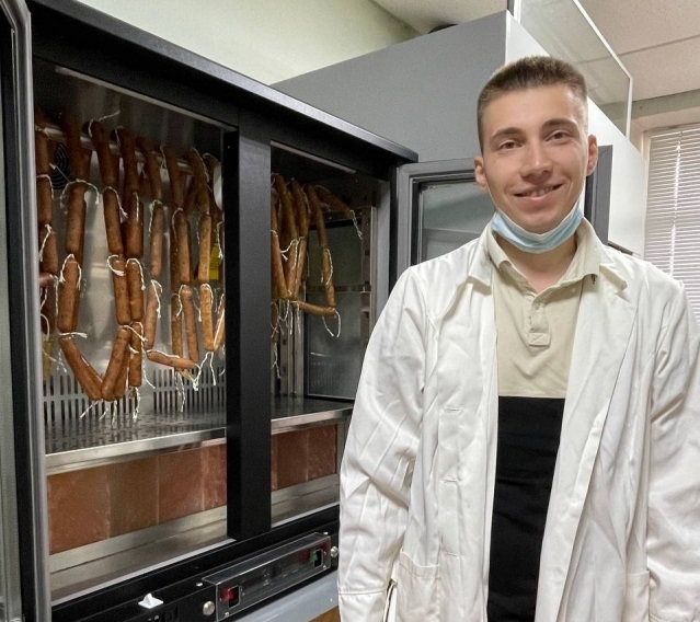 Магістр Ігор Москаленко, незважаючи на локдаун та подальші карантинні обмеження активно працює над виконанням магістерської роботи за темою «Удосконалення технології ковбасних продуктів для дієтичного харчування» під керівництвом к.т.н., доцента кафедри технології м’ясних, рибних та морепродуктів Юлії Крижової.