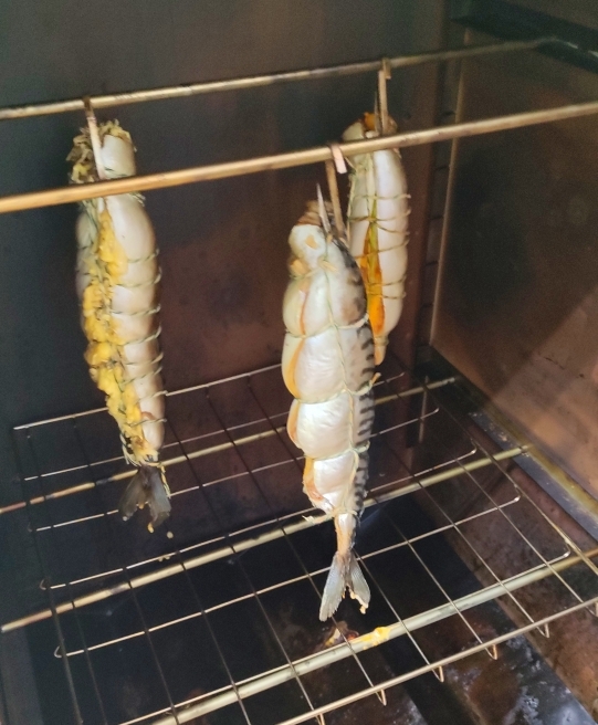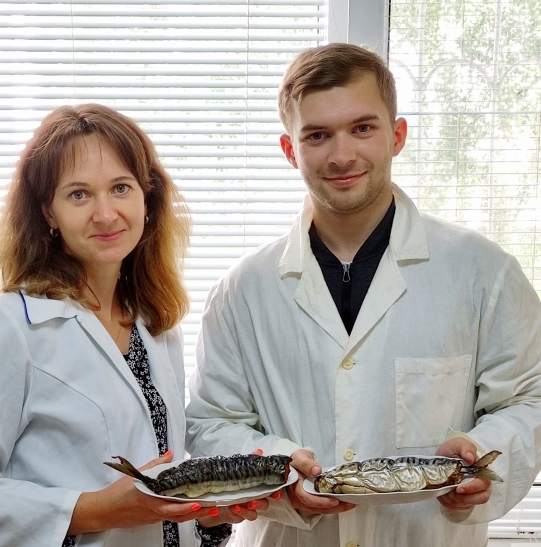 Магістр Олексій Ткачук працює над виконанням магістерської роботи за темою «Удосконалення технології рибних рулетів гарячого копчення» під керівництвом к.с.г-н., доцента кафедри технології м’ясних, рибних та морепродуктів Наталії Слободянюк та к.т.н. Анастасії Іванюти.