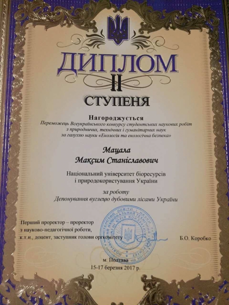 Наукова робота магістра першого року навчання Максима Мацали на тему «Депонування вуглецю дубовими лісами України» (науковий керівник – д-р с.-г. наук Андрій Білоус) була відзначена дипломом ІІ ступеня за перемогу у студентському конкурсі. У своїй роботі Максим здійснив дослідження структури депонованого вуглецю в компонентах фітомаси і мортмаси дубових лісів Полтавщини і Київщини, а також зробив аналіз запасу вуглецю в біомасі дубових насаджень України. Максим проаналізував загальний обсяг депонованого вуглецю та встановив, що частка депонованого вуглецю в мортмасі дубових лісів може становити близько 10 %, що значно менше, порівняно з австрійськими лісами (40 %). Польові дослідження Максим проводив під час комплексної експедиції з студентським науковим товариством «Koło Naukowe Leśników UWM» (Вармінсько-Мазурський Університет в Ольштині).