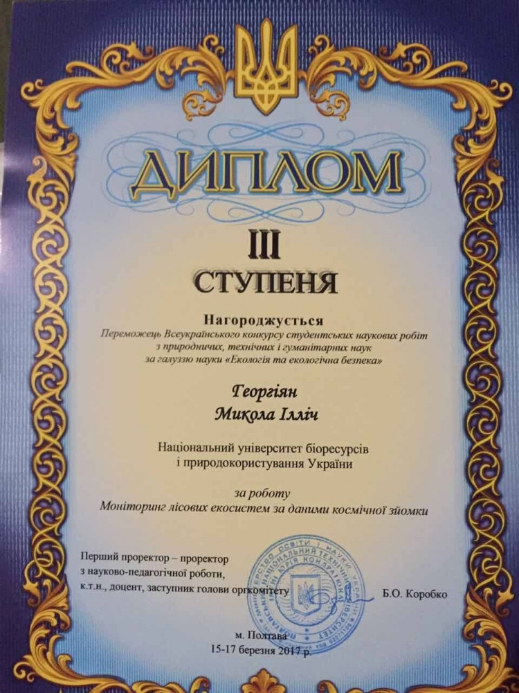 Магістр-дослідник другого року навчання Микола Георгіян за результатами конкурсу нагороджений дипломом ІІІ ступеня за наукову роботу «Моніторинг лісових екосистем за даними космічної зйомки» (науковий керівник – канд. с.-г. наук Віктор Миронюк). Микола у своїй роботі представив результати моніторингу лісових екосистем за даними сезонних композитних зображень Sentinel-2 та здійснив їх аналіз за алгоритмом Random Forest. Магістр Микола Георгіян здійснив моніторинг лісів ВП НУБіП України «Боярська лісова дослідна станція» за даними космічної зйомки та встановив структуру лісового фонду, а також визначив видовий склад лісів.