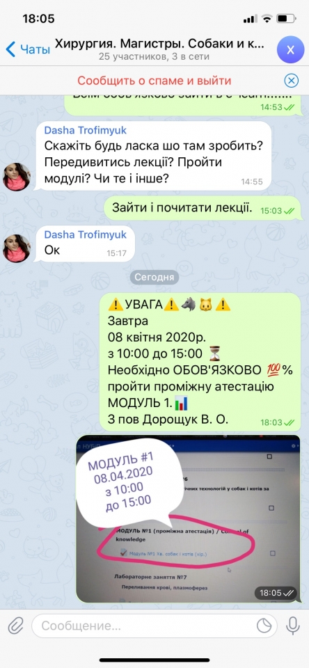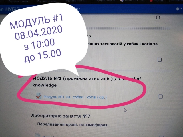 08.04.2020 у магістрів «Превентивні технології забезпечення здоров'я дрібних домашніх та екзотичних тварин» був проведений поточний контроль знань матеріалів першого модуля. Онлайн здало 100 відсотків студентів.