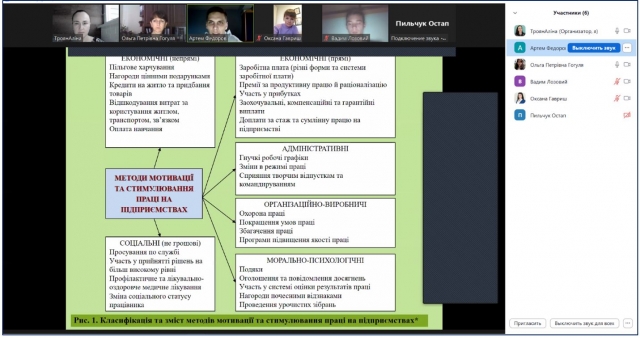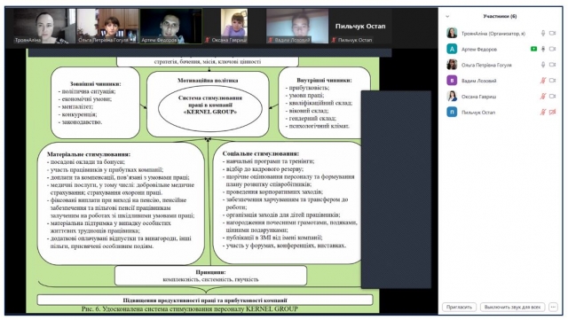 Своїми відповідями на запитання, участю у обговоренні дискусійних питань здобувачі другого (магістерського) рівня вищої освіти спеціальності 073 Менеджмент за ОПП «Менеджмент організацій і адміністрування» другого року підготовки Артем Федоров, Вадим Лозовий, Остап Пільчук засвідчили достатній рівень теоретичних знань і практичної підготовки, що дали можливість поглибити професійні компетентності, необхідні для успішної роботи за обраною спеціальністю. Студенти довели наявність професійних умінь і навичок для прийняття самостійних управлінських рішень, здатність вирішувати проблеми, пов'язані із управлінням сучасними організаціями в реальних соціально-економічних умовах.
