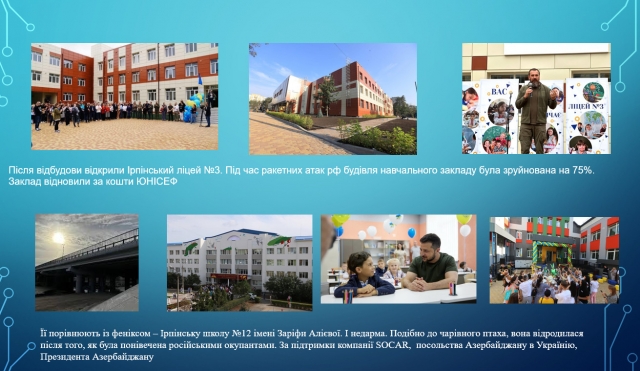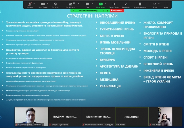 Ірпінський міський голова Олександр Маркушин презентував здобувачам вищої освіти місто Ірпінь, внесок територіальної оборони у зупинення російської армії на шляху до української столиці, за що Указом Президента України №164/2022 місту присвоєно почесну відзнаку «Місто-герой України». Він зазначив, що внаслідок значних руйнувань об’єктів міської інфраструктури та житлового фонду з 2022 року зусилля міської влади спрямовані на їх відбудову, проведення різних інформаціно-комунікативних заходів, пошук інвестиційних ресурсів та інших видів допомоги від міжнародних партнерів. В умовах воєнної агресії рф відбудова та відновлення територіальної громади має стратегічний характер, оскільки комплексний план дій охоплює відновлення доріг, об’єктів енерго- та водозабезпечення, зв’язку, закладів освіти, охорони здоров’я, культури, роздрібної торгівлі та громадського харчування. Загальна суму збитків є непомірно високою для її покриття за рахунок місцевого бюджету. Вирішення проблем відбудови міської інфраструктури потребує пошуку нових форм співробітництва органів місцевого самоврядування з органами державної влади, інститутами громадянського суспільства, представниками бізнесу та міжнародної спільноти. Для цього необхідно застосовувати різні механізми публічного управління та здійснювати пошук найбільш ефективних інструментів їх реалізації на різних рівнях прийняття рішень.