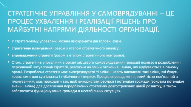 Освітня програма підготовки магістрів публічного управління та адміністрування в НУБіП України за денною та заочною формами навчання передбачає вивчення у 2 семестрі 2023/2024 н.р. дисципліни фахового спрямування – «Технології стратегування в публічному управлінні» (лектор д.держ.упр., доц. Сергій Приліпко), що сприяє формуванню у здобувачів вищої освіти необхідних компетентностей, спрямованих на застосування методологічного інструментарію під час розроблення й реалізації стратегій та цільових програм розвитку на різних рівнях управління. Під час вивчення технологій стратегування магістри повинні навчитися не лише розробляти програмні документи, використочуючи комплексний підхід до інтегрованого розвитку територіальної громади, а й надавати органам публічної влади рекомендації щодо застосування необхідних інструментів реалізації стратегій і програм.