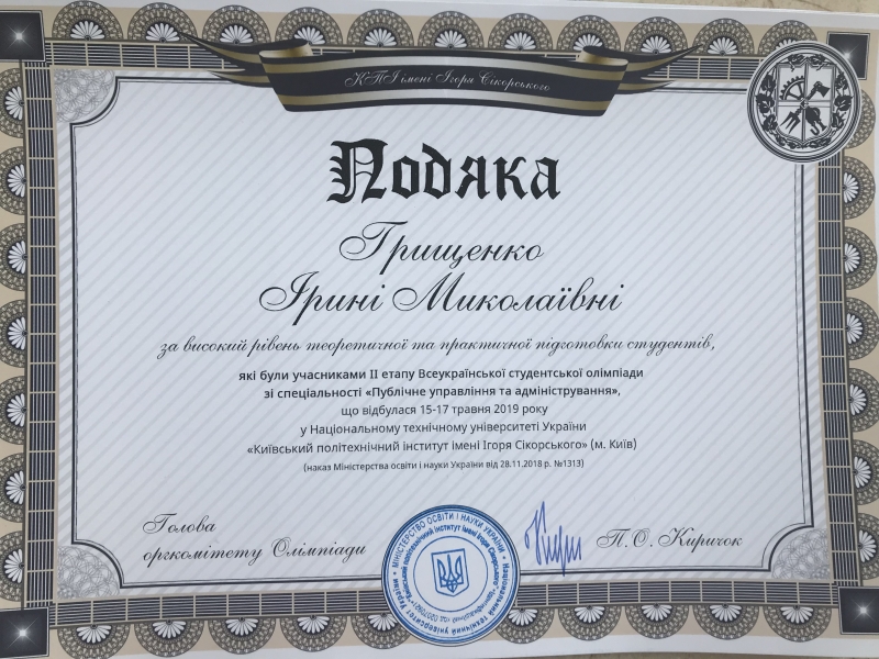 Варто зауважити, що такі високі результати магістрів НУБіП України зі спеціальності «Публічне управління та адміністрування», у порівнянні з іншими учасниками Всеукраїнської олімпіади, є результатом системної, плідної роботи всього колективу НУБіП України: ректора та його команди, які підтримують будь-які починання - проведення круглих столів з розгляду актуальних питань публічного управління; Всеукраїнських конференцій з місцевого самоврядування; скайп-дискусій слухачів з провідними фахівцями обласних державних адміністрацій та об’єднаних територіальних громад; міжнародних стажувань викладачів тощо. Керівництво ННІ післядипломної освіти Кулаєць Марія разом із своїми заступниками Микицей Терезою та Олійником Володимиром роблять все можливе для укріплення матеріально-технічної бази - лекційні аудиторії та лабораторії обладнані найновішими комп’ютерами, інтерактивними дошками, витратними матеріалами, без яких неможливо підготувати сучасного фахівця для органів публічної влади. Науково-педагогічні працівники кафедри публічного управління та менеджменту інноваційної діяльності, зокрема Грищенко Ірина, яка готувала учасників до Всеукраїнської олімпіади зі спеціальності «Публічне управління та адміністрування» мають підтримку й можливість готувати високопрофесійних фахівців для органів державної влади та органів місцевого самоврядування, що й довели результати олімпіади, проведеної за участю провідних закладів вищої освіти, що готують магістрів за спеціальністю 281 «Публічне управління та адміністрування».