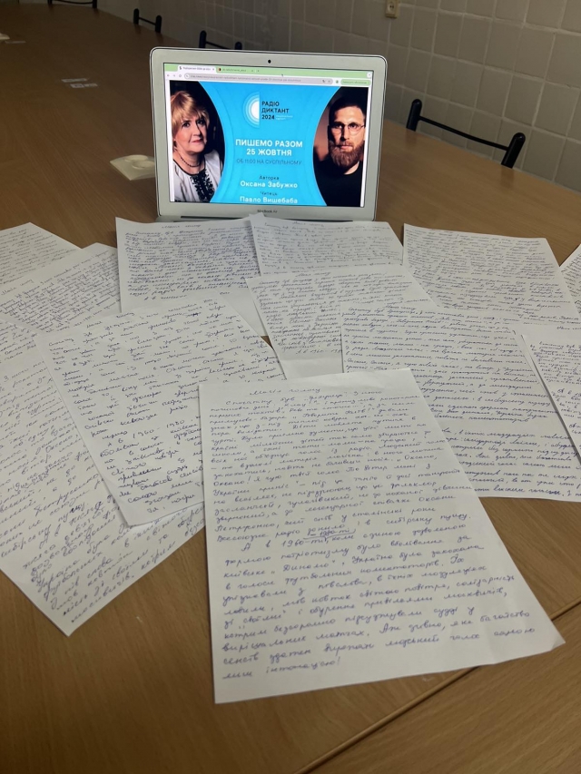 Ми впевнено тримали ручки, хоча за вікном уже пронизливо лунала сирена повітряної тривоги, сміливо підкорялися магії голосу українського поета та військового Павла Вишебаби, який прочитав текст Радіодиктанту, присвяченого Українському Радіо, яке святкує своє сторіччя у листопаді 2024 року: «Та, попри всі зміни технологій, от уже сто років Україна звучить в ефірі планети власним голосом».