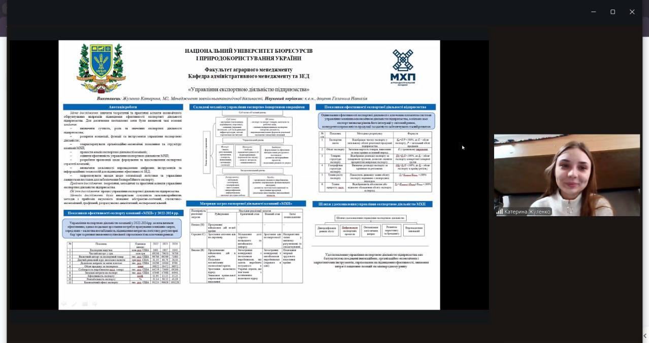 Постерні презентації продемонстрували високий рівень підготовки магістрантів, їхню здатність застосовувати набуті знання на практиці та робити обґрунтовані висновки щодо підвищення ефективності діяльності підприємств у міжнародному середовищі. Представлені результати свідчать про глибоке розуміння здобувачами сучасних тенденцій у сфері менеджменту, стратегічного управління та зовнішньоекономічної діяльності.