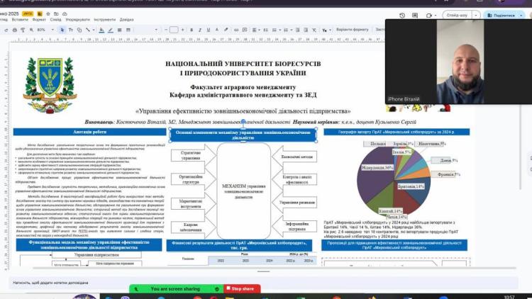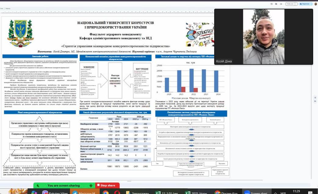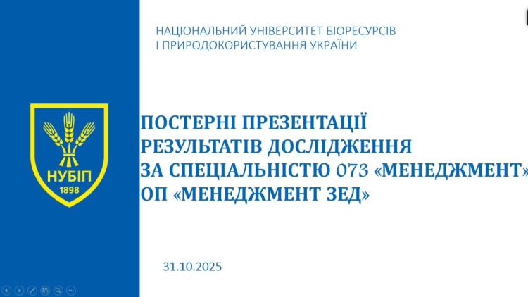 31 жовтня 2025 року у Національному університеті біоресурсів і природокористування України відбулися постерні презентації результатів досліджень здобувачів другого (магістерського) рівня вищої освіти за спеціальністю 073 «Менеджмент» освітньої програми «Менеджмент зовнішньоекономічної діяльності». Захід проведено відповідно до «Положення про підготовку і захист магістерської кваліфікаційної роботи», яке визначає, що участь у постерній конференції є обов’язковою умовою допуску здобувача до захисту магістерської роботи перед екзаменаційною комісією.