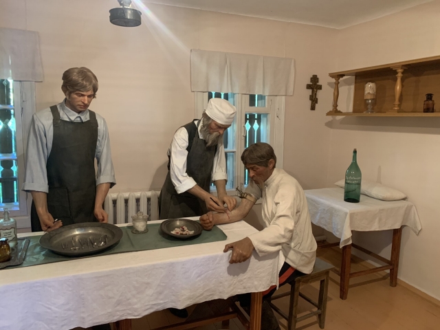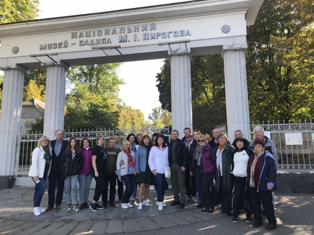 Потім ми завітали до Національного музею-садиби М.І. Пирогова у живописній садибі Вишня, де жив і працював видатний вчений, геніальний хірург, анатом, творець воєнно-польової хірургії, засновник Товариства Червоного Хреста, прекрасний педагог і громадський діяч Микола Іванович Пирогов. Об’єктами музейного комплексу є будинок і аптека, які споруджені М.І. Пироговим, та церква-некрополь. Тут покоїться набальзамоване тіло М.І. Пирогова. З 2018 р. увесь комплекс робіт з ребальзамування тіла М.І. Пирогова і спостереження за ним успішно виконують наукові спеціалісти України (Вінниця, Київ, Суми), в тому числі і фахівці з нашого університету.