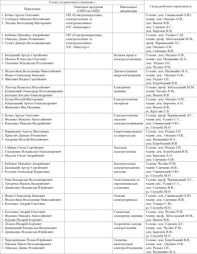 Робочі оргкомітети з проведення І етапу студентських олімпіад з навчальних дисциплін, спеціальність і освітніх програм ННІ енергетики, автоматики і енергозбереження.