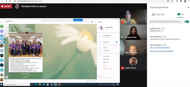 В рамках вивчення дисципліни "Групова динаміка і комунікації" (викладач: Кузьмінська Олена Геронтіївна, доцент кафедри інформаційних систем і технологій) студенти, працюючи у малих групах, моделювали роботу професійних команд з розробки програмних продуктів. Особливістю роботи було те, що проєктне завдання полягало у розробці чат-бота для полегшення супроводу абітурієнта при вступі на магістерську програму в рамках проєкту "Агрокебети". Звичайно, велике значення мало те, що у проєкта є цікавий та наповнений сайт agrokebety.com, що дозволило проектній команді правильно прописати алгоритми.