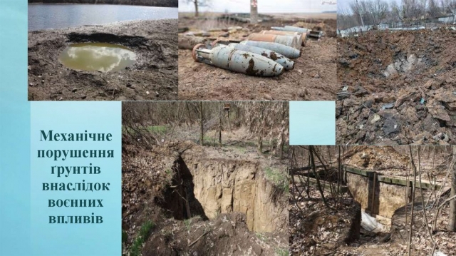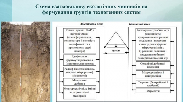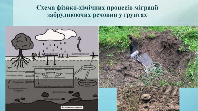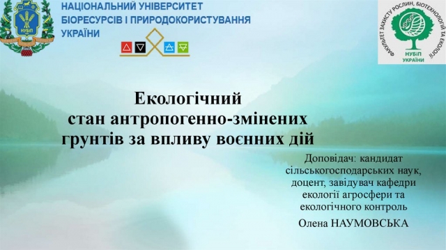 Олена Іванівна розповіла про чинники ґрунтоутворення, показала схему взаємовпливу екологічних чинників на формування ґрунтів техногенних систем, генетичний ряд ґрунтів з різним ступенем антропогенних трансформацій та ґрунтовий покрив м. Києва. В своїй доповіді вона зосередила увагу на механічному порушенні ґрунтів внаслідок воєнних впливів, детально зупинилась на видах вибухових процесів та схемі фізико-хімічних процесів міграції забруднюючих речовин у ґрунтах. Провела групування елементів-забруднювачів за їх біоакумулятивним ступенем, наголосивши, що, наприклад, Cd, Cs, Rb це елементи інтенсивного поглинання, а от елементи Se, Fe, Ba, Te важкодоступні для рослин. Олена Іванівна в презентації також розповіла про методи рекультивації забруднених ґрунтів та різновидності фітосанації ґрунтового покриву. «Під впливом довготривалого сільськогосподарського використання, зрошення земель водами різної якості або вилучення земель зі зрошення фіксують еволюційні зміни напрямленості ґрунтових процесів і режимів, трансформацію властивостей ґрунтів, що потребує проведення моніторингових спостережень. Для збереження, охорони ґрунтів і збалансованого землекористування необхідна регламентація антропогенного навантаження на ґрунти на засадах визначення прийнятного екологічного ризику їхньої деградації та врахування стійкості ґрунту до зовнішніх чинників», — говорить Олена Наумовська.