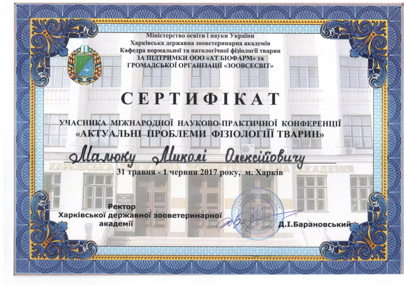 Д.вет.н., професор М.О. Малюк прийняв участь у роботі Міжнародної науково-практичної конференції "Актуальні проблеми фізіології тварин", що відбулася у стінах Харківської державної зооветеринарної академії. (м.Харків).