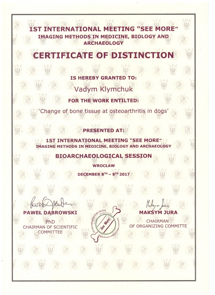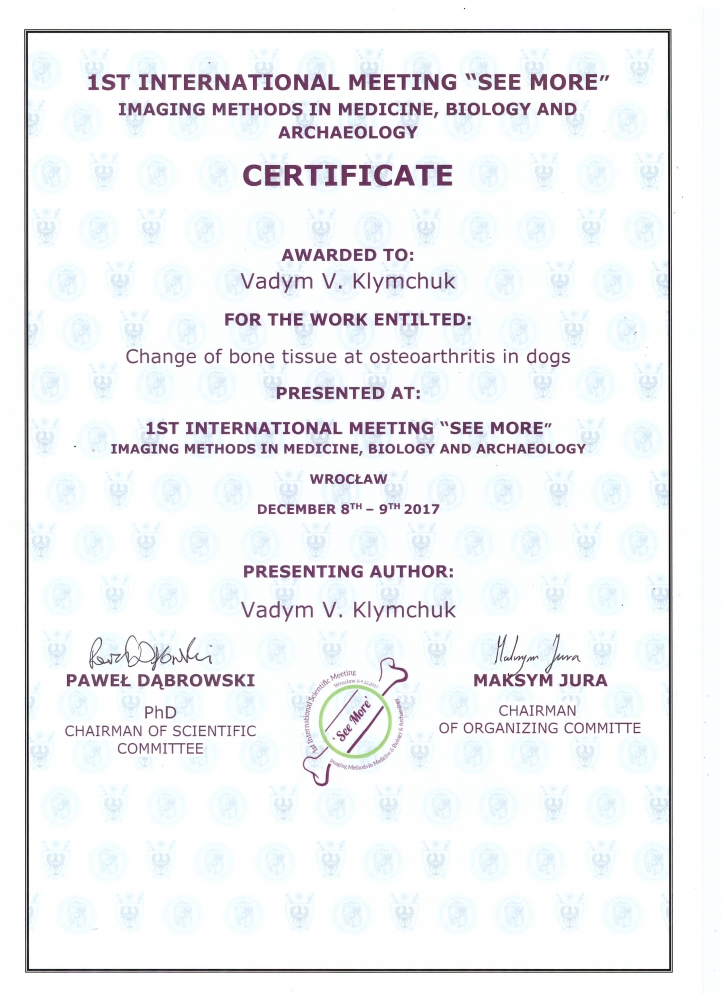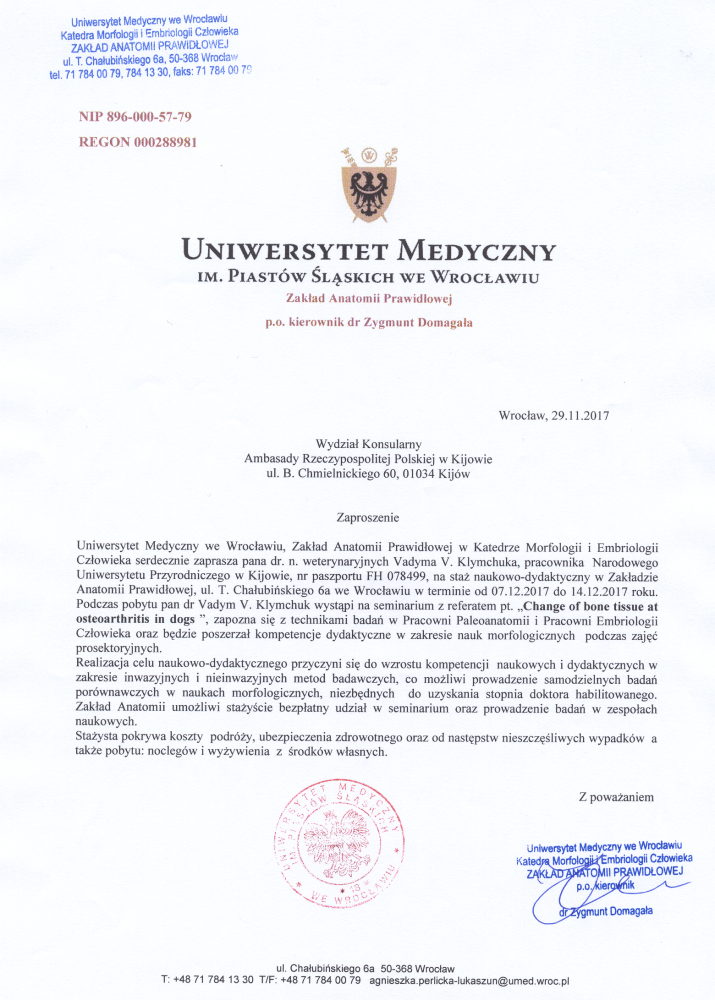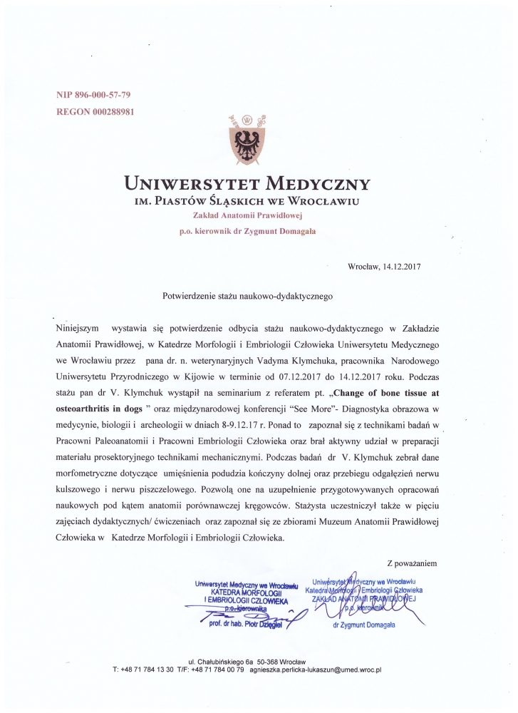 З 7 по 14 грудня 2017 року асистент кафедри хірургії і патофізіології ім. акад. І.О. Поваженка Климчук Вадим Васильович та асистент кафедри анатомії, гістології і патоморфології тварин ім. акад. В.Г. Касьяненка Мельник Олексій Олегович, на запрошення Вроцлавського медичного університету, взяли участь у 1 Міжнародному семінарі "SEE MORE" новітні методи медицини, біології і археології, а також пройшли стажування на кафедрі анатомії людини Вроцлавського медичного університету.